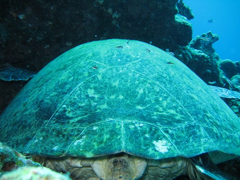 アオウミガメのケツ。 こんもりした甲羅だ。 |