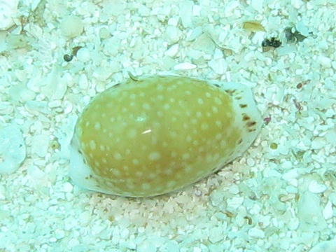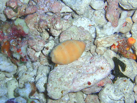 ウコンハネガイがいた岩の砂底にナシジダカラが ころんと転がっていた。 |