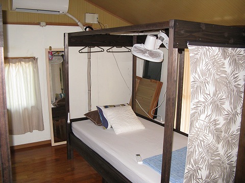 今回俺は、←の写真の右のベッドを使うことにして、 セッティングしてもらった。 なお、全てのベッドに真上から扇風機がスタンバイしているので、 宿泊者全員が涼しく過ごすことができるよ。 |