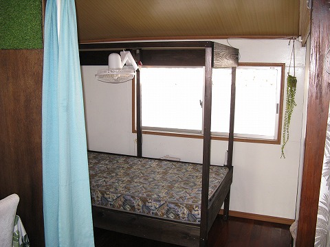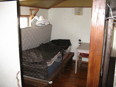 | 建物のセンター奥にはベッドが1つ。 | ←の写真の右側には、さらにベッドルーム (この日はセッティングされていません。)。 ここだけ個室になる(ふすまで仕切れる。)ので、 俺のようにイビキがやかましいヤツがグループにいても ここに押し込めばいくらか「公害」が軽減される、かな。 |