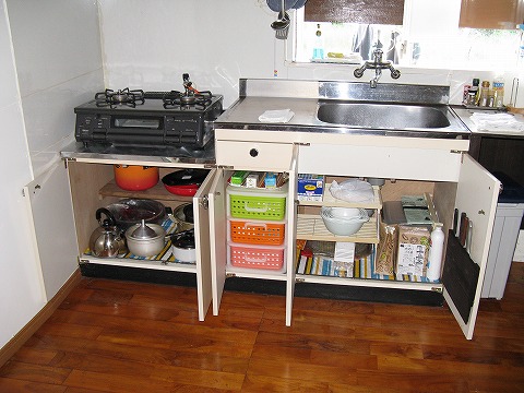 | 流しの下には調理器具類や袋が用意されている。 |