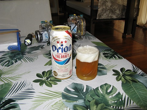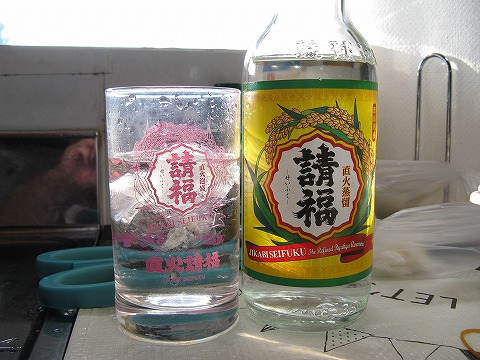 | さて、一通り観察が終わったら、呑むベ。 グラスは、ペットボトルを切った下部。 「たらま家」にもちゃんとグラスはあるんだけど、 何となくこっちを使っちゃった。 |