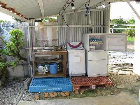 門を入ってすぐ左には、水回りと洗濯のスペース。 洗濯ばさみなどは冷蔵庫にしまってあるのでよく冷えている (ウソ。電源は入っていないよ。ただの箱。)。 |