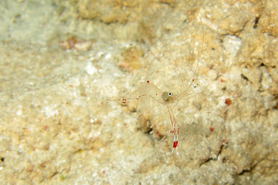 | 根の穴ボコにいたオトヒメエビ。 カメラを向けても大して引っ込まなかったので、 何枚も撮影できた。 実は、この写真はカメラをひっくり返して撮影している。 つまり、オトヒメエビは、穴ボコの天井に逆さになっているんだね。 普通に撮影してから後で写真を回転させようかとも思ったが、 そういう加工をするのではなく(何となく不自然になることが多い。)、 そもそもカメラを逆さにした。 |