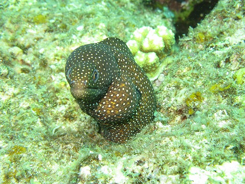 小さめのハナビラウツボ。 口の中が真っ白なので、口を開けるのをしばらく待っていたのだが、 結局開けてくれなかった。ケチ。 |