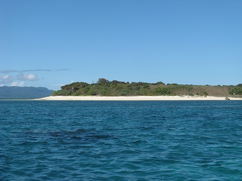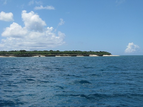 | 今日のダイビングが終わったが、サプライズで、 上地島と下地島の間でシュノーケルをさせてくれるって。 わ〜い。 写真の島は上地島。 |