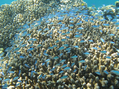 サンゴがたくさんあるポイントで遊んだ。 この写真は、水深僅か1mほど。 デバスズメダイはサンゴの間に引っ込みがちだが、 コイツらは俺がいても出てきていたので、撮影はラクだった。 |