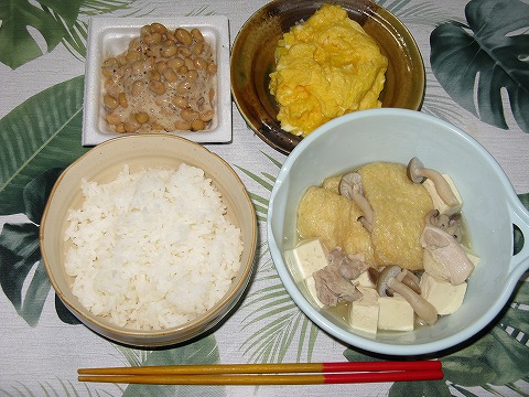 では、くゎっちーさびら。 昨日の晩とほぼ同じ献立だ。 喰い終わったかみやーき小のかまぼこがないぐらい。 |