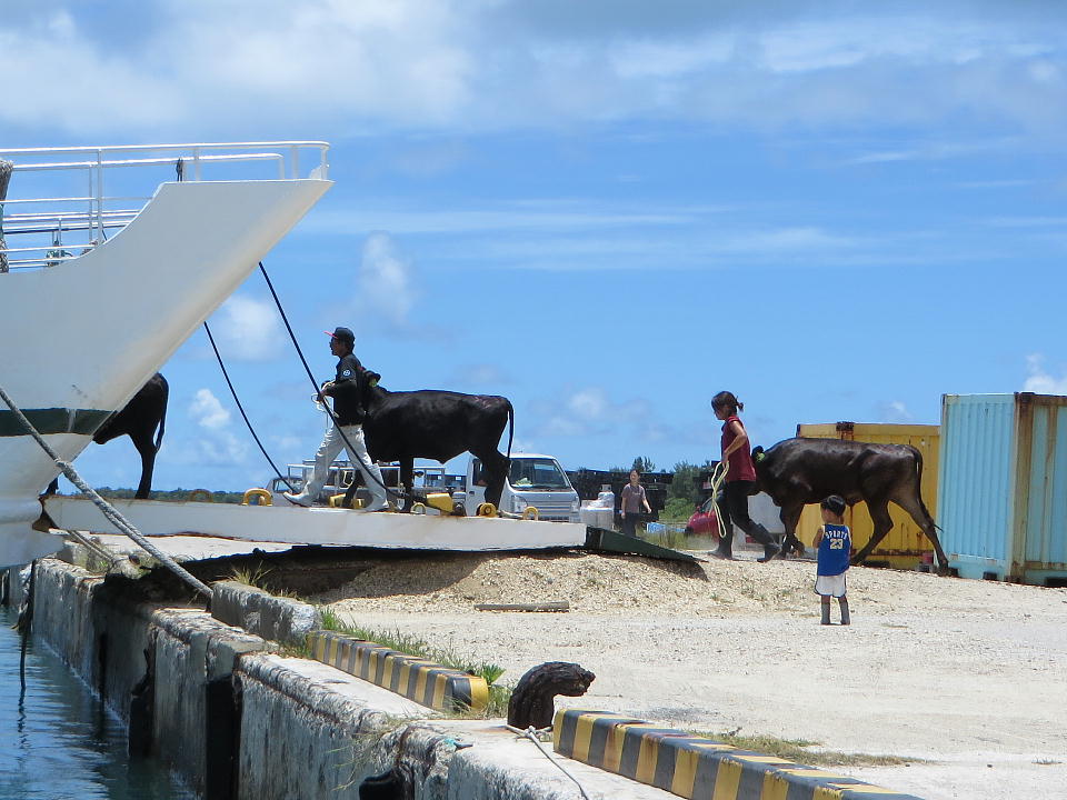 | 高速船で石垣島から約30分で黒島に着いた。 港では、特産の牛が農協のフェリーに積み込まれていた。 「ドナドナ」だな。 |