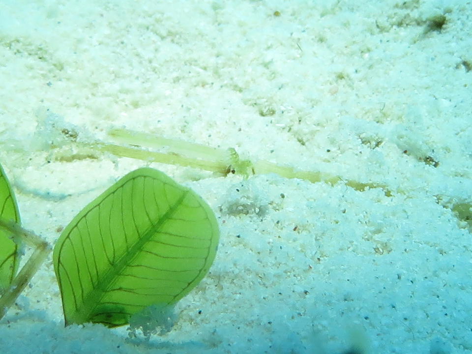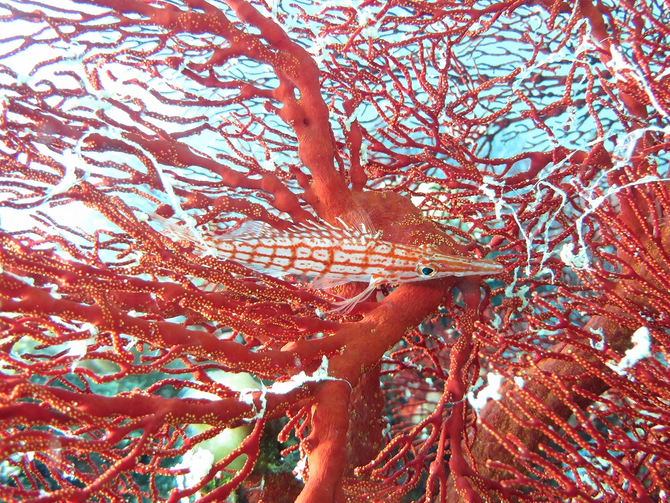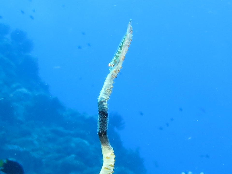 | 「竜宮2」のポイントで潜る。 僅か-4.4mにクダゴンベくん。 なかなか横になってくれなかったので、それならば、とカメラを縦にして撮影した。 写真左側が水面だよ。 |