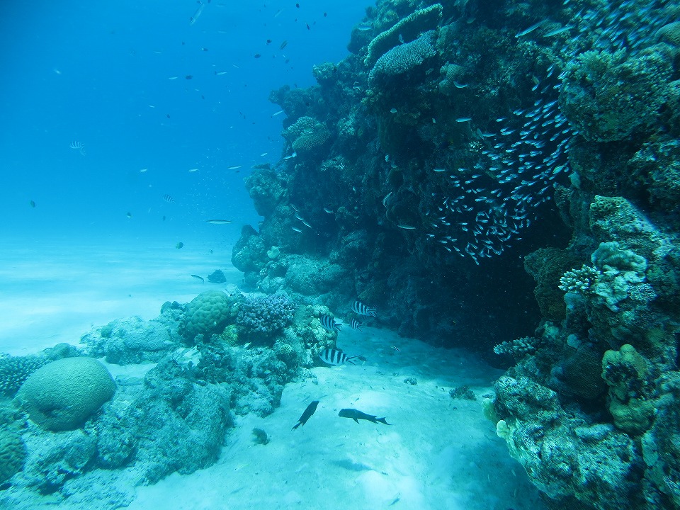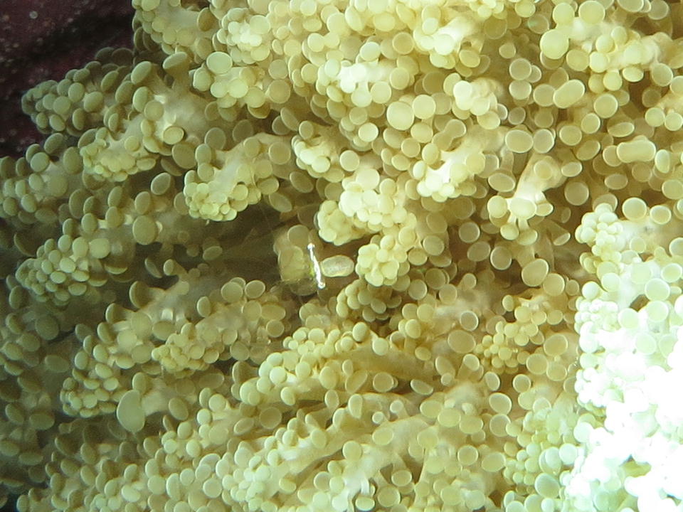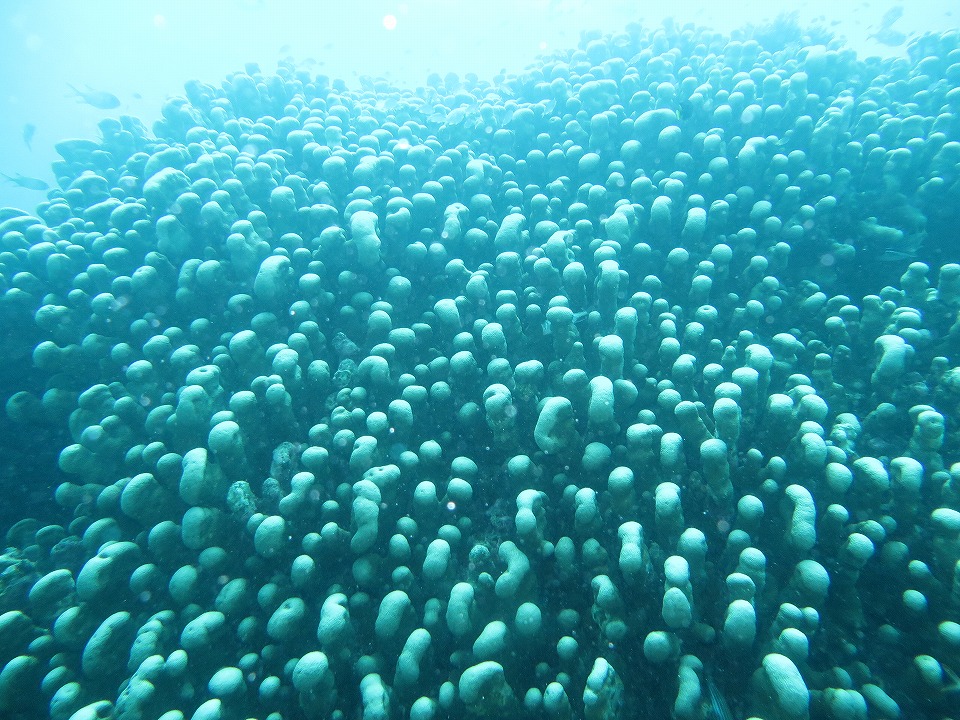| ラストダイブは「ジャガイモ畑」ポイント。 ポイント名の「ジャガイモ」の由来はこのコモンシコロサンゴ。 もうちょっと透視度がよかったら、もっとワイドに撮影したところだが、 この透視度だと、ワイド撮影しても濁りが強調されるだけ。 |