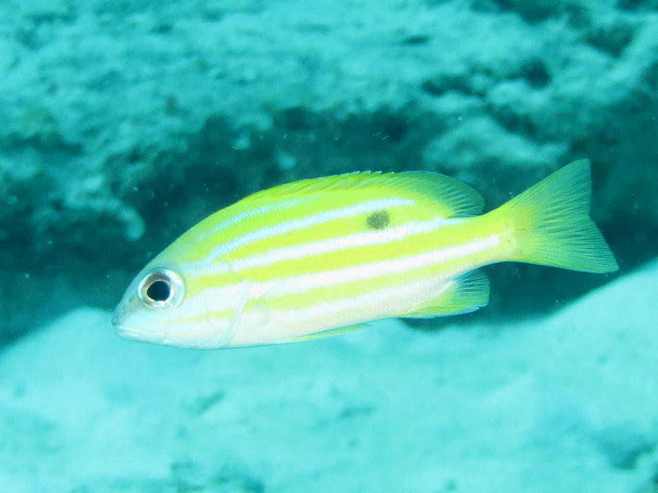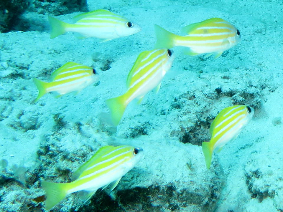 | ヨスジフエダイygが少し群れていた。 写真の1番右上の個体はロクセンフエダイ。 背中近くにうっすら眼状紋がある。 他の「ヨスジ」に比べて、線が5本ある。 「ロクセン」じゃないじゃないかと思うが、前に回ると、鰓蓋んところに線がもう1本あるらしい。 |