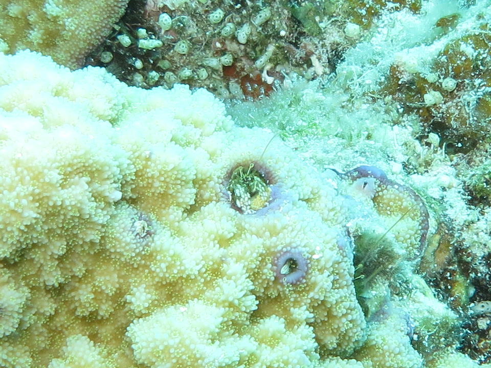 | このカンザシヤドカリは、ハサミの模様が「実線」ではなく「点線」。 もっと近付いて撮影したいが、近付くとすぐ引っ込んでなかなか出てこない。 |
