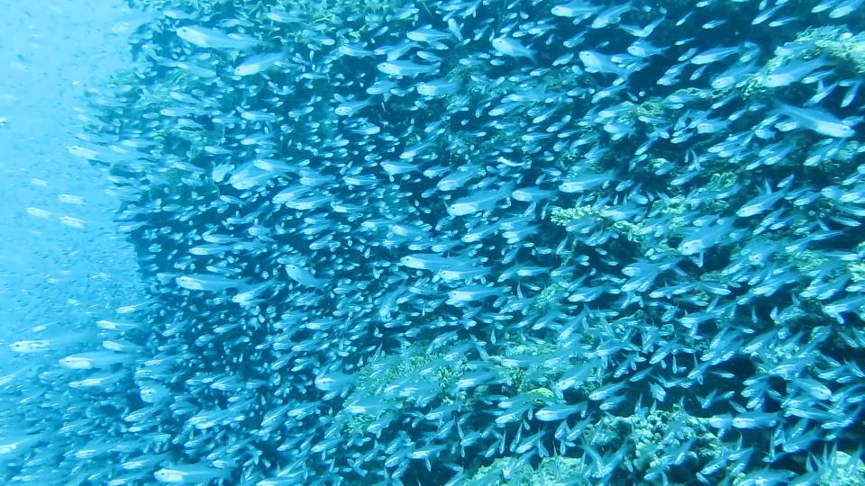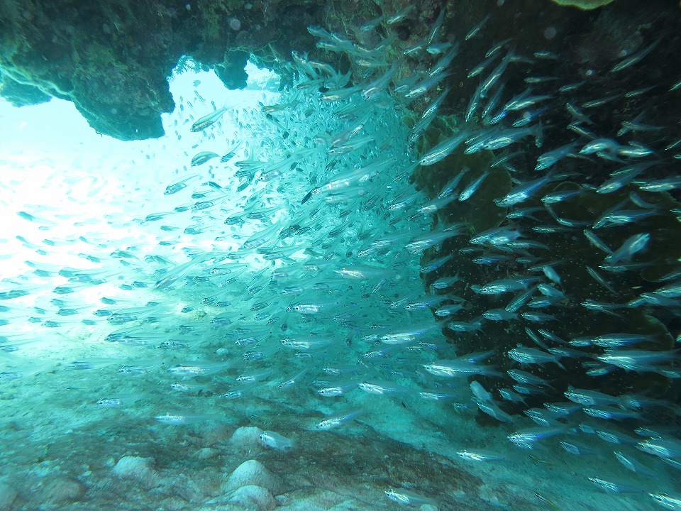 | 3本目は「港前」ポイントで潜る。 スカシテンジクダイがたくさん群れている。 逆光で見ると特にきれいに輝く。 |