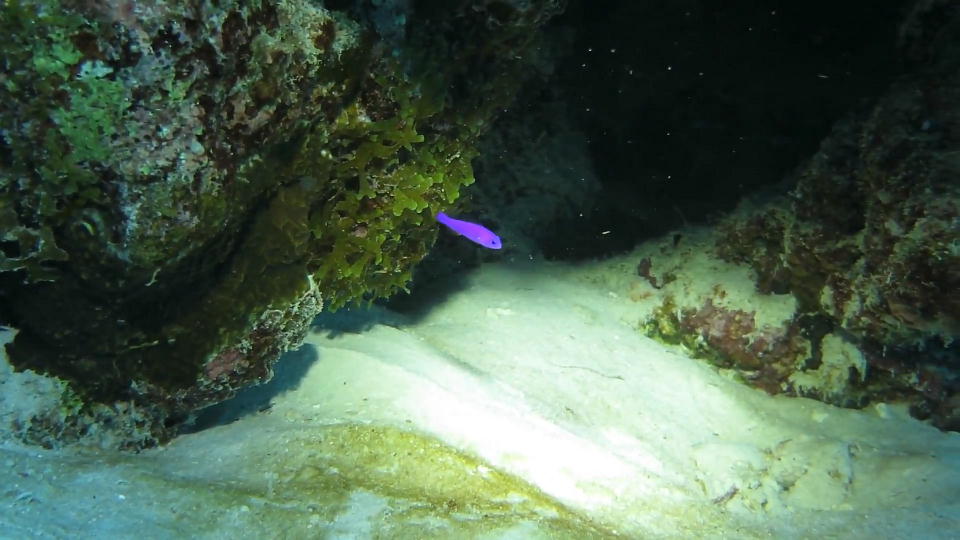 | 俺が大好きなクレナイニセズズメ。 臆病な魚で、すぐ岩場に引っ込むので撮影が難しい。 約20秒の動画はこちら。 よく見ると、底をオビヨウジがニョロニョロを動いていたね。 撮影時は気が付かなかった。 |
