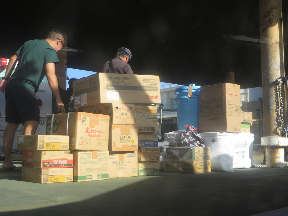 | 朝の離島ターミナルでは、各島に送る物資が桟橋に山積みになる。 |