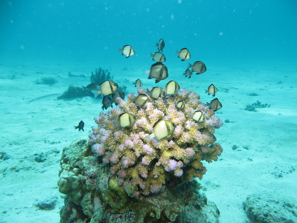 | 小さな根に群がっているフタスジリュウキュウスズメダイ(yg)。 俺はこういうスモールワールドが大好きだ。 もっと小さく、しかもサンゴより下の部分がない背が低い根だったらなおよかった。 |
