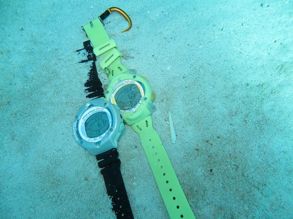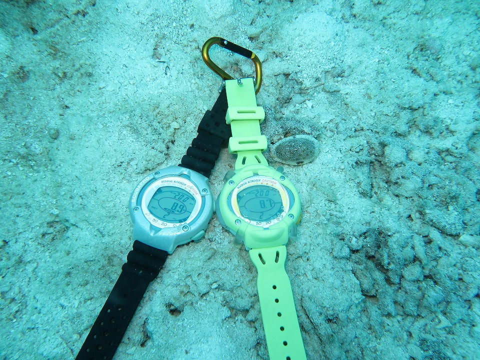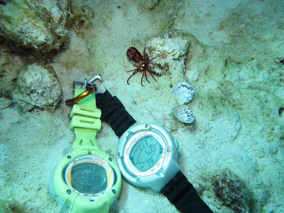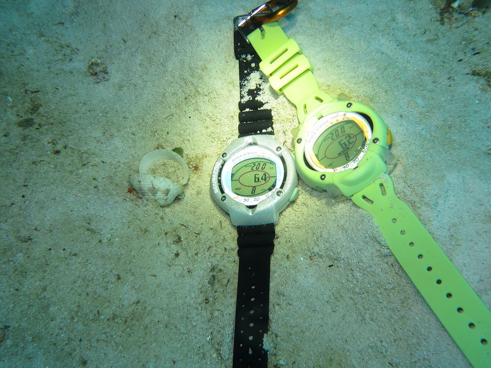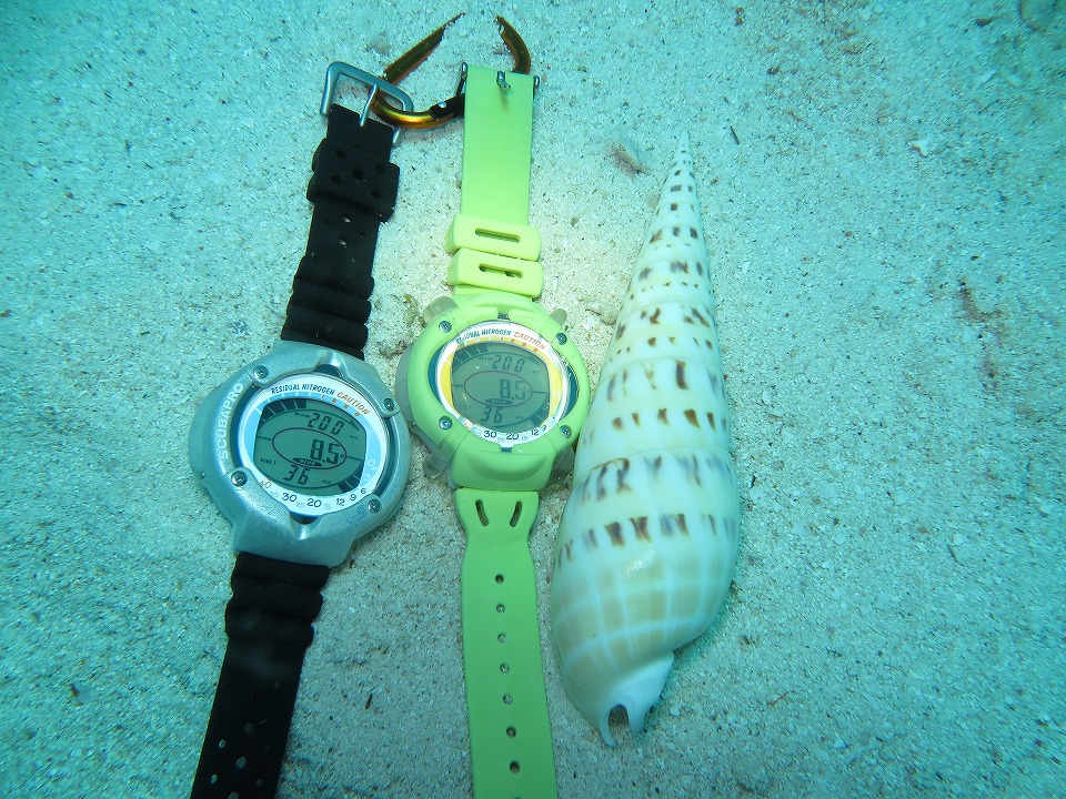 | 2枚がくっついたマルオミナエシを発見した。 きれいな(=俺的にいうAレベル。)のタカラガイ系以外はそろそろ採集をやめようと思っているのだが、 いい状態の貝殻を見つけると拾ってしまう…。 ところで、写真の2個のD.C.(ジャンクを格安でポチして、俺が整備した。)は、 拾った場所の水深を記録するためなのだが、 2個の理由は、1個だと、D.C.の向きなどにより、水深の数字が写真に写らないことがあったから。 2個にしてからは、置いたときに少しでも向きが異なるので2個とも水深が写らないことは、今のところない。 この写真のように、水深がいっつもきれいに写ってくれればいいんだけど、 水深が写らなかったときに撮り直しができるときばかりではないので、この2個体制はなかなか有用だと思っている。 D.C.の誤差も分かるよ(笑)。 |
