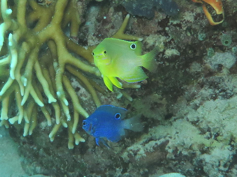 | ニセネッタイスズメダイ(黄)と、ナガサキスズメダイ(青)。 単なる色違いのように見えるね。 |