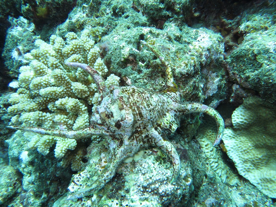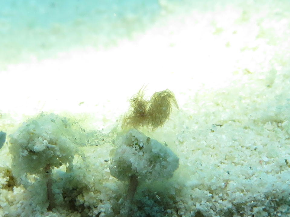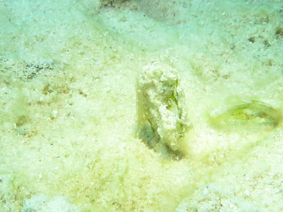 | 黒島に着いて早速1本目。「だるま」ポイント。 ENしてすぐトウカムリがあった(いた)のでひっくり返してみたら、 当然?のごとく中身があった。 コイツの貝殻だけって見たことないな〜。 貝殻があったら喜んでGETするんだけどな〜。 |