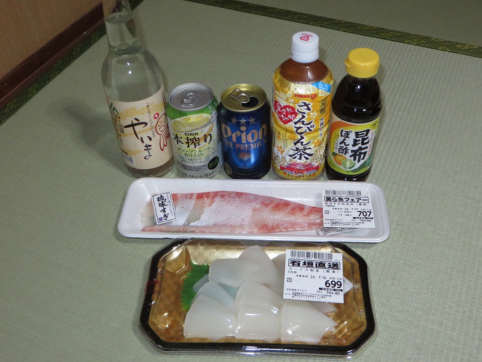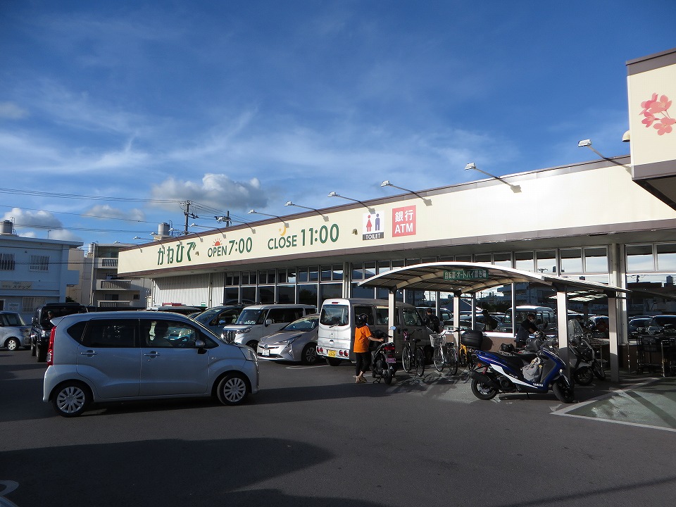 | いったん民宿に戻ってちょっとボケッとしたら、空港線のバスで「かねひで」に買い出しだ。 今日は日曜日なので、いつも呑んでる「南ぬ島」がお休みだ。 だから、スーパーで何か探すのだ。 |