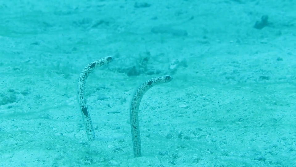 | 2本目は「竜宮」ポイント。 チンアナゴを三脚を立てて撮影。 約30秒の動画はこちら。 光をもっと当てて撮影したいので、もっと強力なライトをGETして、来年再チャレンジだ。 |