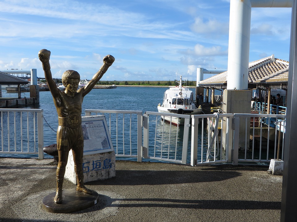 | 離島ターミナルに置いてある、具志堅用高さんの像。 この像と同じように両手を挙げてポーズを取って一緒に撮影する旅行者が多い(笑)。 |