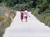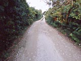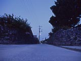 | 墓地。沖縄ならではの亀甲墓。 | ニーラン石。西桟橋からコンドイビーチに向かって浜づたいに歩いてくる途中。 | コンドイビーチから集落へ帰る途中の道。 | 途中で左から立派な道と合流する。振り返って撮影。 | 民宿の前で緑の点滅する小さな光を見つけて「ホタルがいるっ!」と喜んで真っ暗な中で目測で写真を撮ったら、こんな得体の知れない物が写って、びっくらこいた。 |