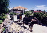 | 港での、レンタサイクルや水牛車の呼び込み。 後ろの赤瓦は港の東屋。 |