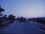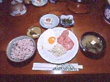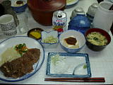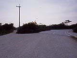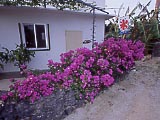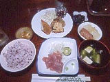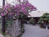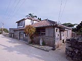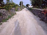| 入口にブーゲンビリアが咲く、松竹荘。 | 松竹荘のシーサー。 | 松竹荘の晩飯。 | 松竹荘の朝飯。 | 明け方の道。 | 港へ行く途中の二股道。まだ、船が動いていないので島は静か。 |