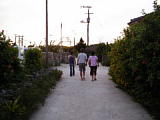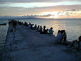 | 小浜荘「別館」のシーサー。尻尾がカワイイ。 | 小浜荘「本館」の庭から、「別館」を望む。 | さ、晩メシも喰ったし、夕日を見に行こう! | 夕暮れ時の西桟橋。みんな晩メシを終えてから、黄昏に来る。 |