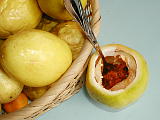 | まだ熟していないパッションフルーツ。 | ←が熟すとこうなる。 中のタネを食す。 ポリポリとした歯ごたえで、 酸っぱくて旨い。 小浜荘のおばちゃんが 喰わせてくれた。 ごちそうさまです。 |