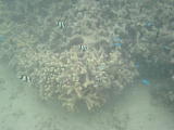 | ある日の小浜荘の晩メシ。 | ある日の小浜荘の朝メシ。コメは黒紫米。 | 小浜荘の天井にいたヤモリくん。 | にゃんこしぇんしぇ〜。 | au by 沖縄セルラーのW42CAで撮ってみた水中写真。水深50cmぐらい。画質には加工を加えず、そのまま縮小しました。そこそこ撮れるもんだ。ちょっとモヤがかかった感じに見えるのは水深が浅いことによる透明度の低さに加えて日差しがあるため。海水に浸けて撮影した後、ビーチではとりあえず水気を切り、宿に戻ってから水道水で洗った。その後端末には何の問題も起きていないが、他の方がマネをして水没などの被害を受けても、わんは責任を負いかねますので、悪しからず。 |