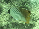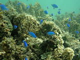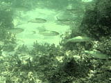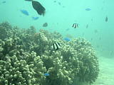 | グルクンの一種か。水深1〜2mぐらいの浅瀬をまるで何かに追われているように大群が猛スピードで泳いでいた。なかなか静止したショットが撮れなかったが、何とか納めた1枚。 |