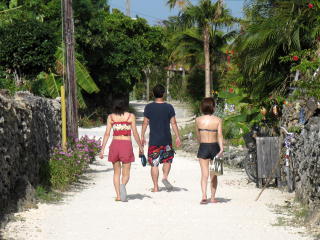 | 朝の風景。 まだ石垣島からの観光客が来ていないので、 のんびりといい時間を過ごすことができる。 これは竹富島に泊まらないと経験できないよ。 |