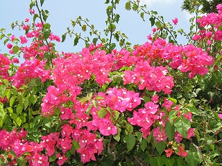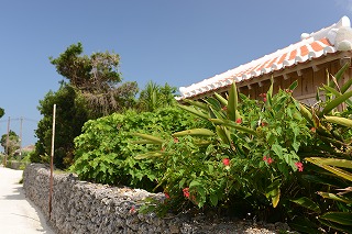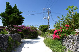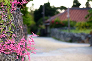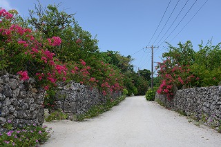 | ブーゲンビリアとサンゴの石垣とサンゴ砂の道。 |