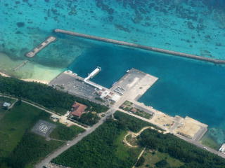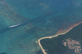 | 竹富東港。 北風の時期だったので、 石垣空港へ南からアプローチするため、 竹富島上空を飛行した。 与那国発石垣行RAC772便から。 |