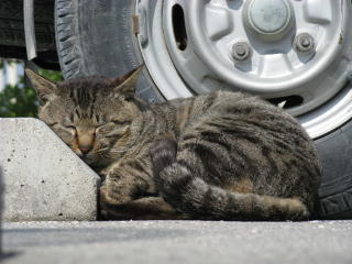 東港桟橋の駐車場で のんびりと昼寝していたどらねこ。 とはいえ、あちくねーのか?おい。 |