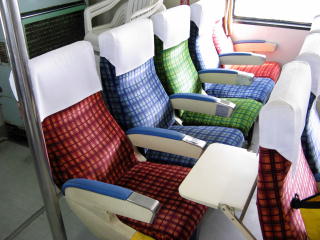 「にぃぬふぁぶし」の座席。 リクライニングはするし、 前の席の背中にテーブルは付いてるし、 新幹線みたい。 |