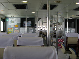 「にぃぬふぁぶし」の船内。 朝の石垣島発の便には結構客が乗っていたが、 折り返しの竹富島発はガラガラ…。 |