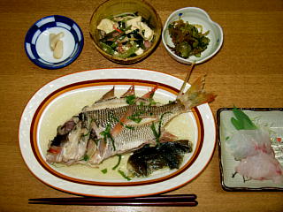 | 「小浜荘」の晩メシ。 この日は、クチナギのマース煮がメイン。 実に旨い、が、煮魚をじっくりつつくのが 大好きな俺にとっては、 マース煮をてきとーに食して早々に 西桟橋に行こうとする客が多いと、 焦ってゆっくり食せないんだんな。 でも結局開き直って、 骨だけになるまでつついたけどね。 |