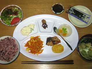 「小浜荘」の朝メシ。 定番の黒紫米。 赤飯と間違える客が多い。 |