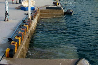 前日の夜が満月だったので、 大潮の竹富港。 満潮から1時間ほど経った状態。 岸壁ギリギリまでタップンタップン。 |