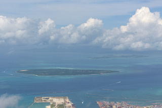 | 手前から 石垣島の市街地、竹富島、小浜島。 石垣発与那国行きRAC741便から。 |