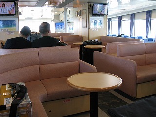 | 竹富島行きの高速船は 大型タイプだった。 丸テーブルなんかがあっちゃったりして、 団体さんが喜びそうに造ってあるね。 |