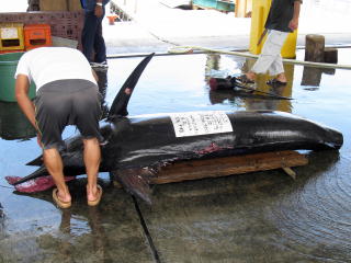 カジキは足が早いので、炎天下の 「お立ち台」にぶら下げるのはごく短時間。 |