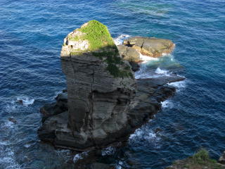 | 立神岩。 島の上の右から1/3ぐらいのところに 人が1人いるのが分かるかな。 |
