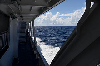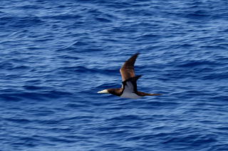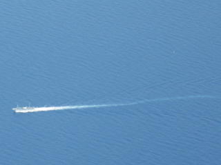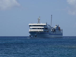 ずるいカツオドリ。 フェリーを止まり木にして、 トビウオが飛ぶと狙いに行く。 運賃を払いなさい(笑)。 |