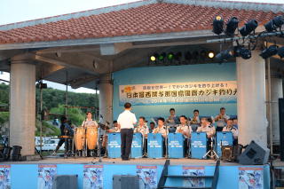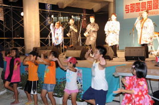 | ステージ上でうちなー系の曲を 演奏し始めたと思ったら、 地元のわらばーどもが 誰からともなく前に出てきて カチャーシーを踊り始めた。 全く何のやらせもなしだが、 カチャーシーがみんなうまいのなんの! |