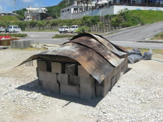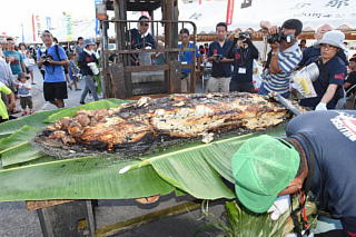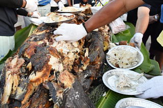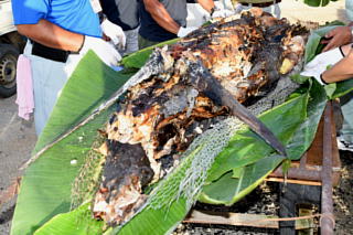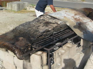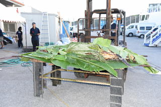 | カジキ釣り大会最終日の夜に 振る舞われるカジキの丸焼き。 なんか、亀甲墓みたい。 |